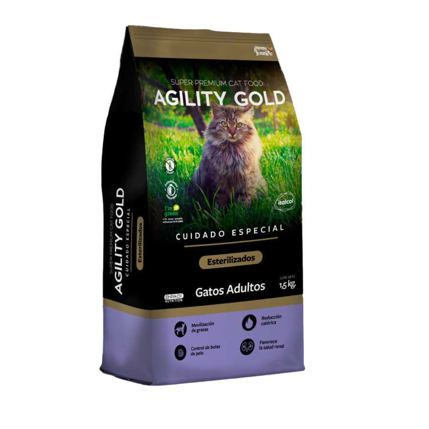 Agility Gold Esterilizados es un producto específico para cubrir las nuevas necesidades de un gato esterilizado o castrado; gracias a su fórmula diseñada con alto contenido proteico (36%) de origen animal, manteniendo la masa muscular y favoreciendo la palatabilidad del alimento.