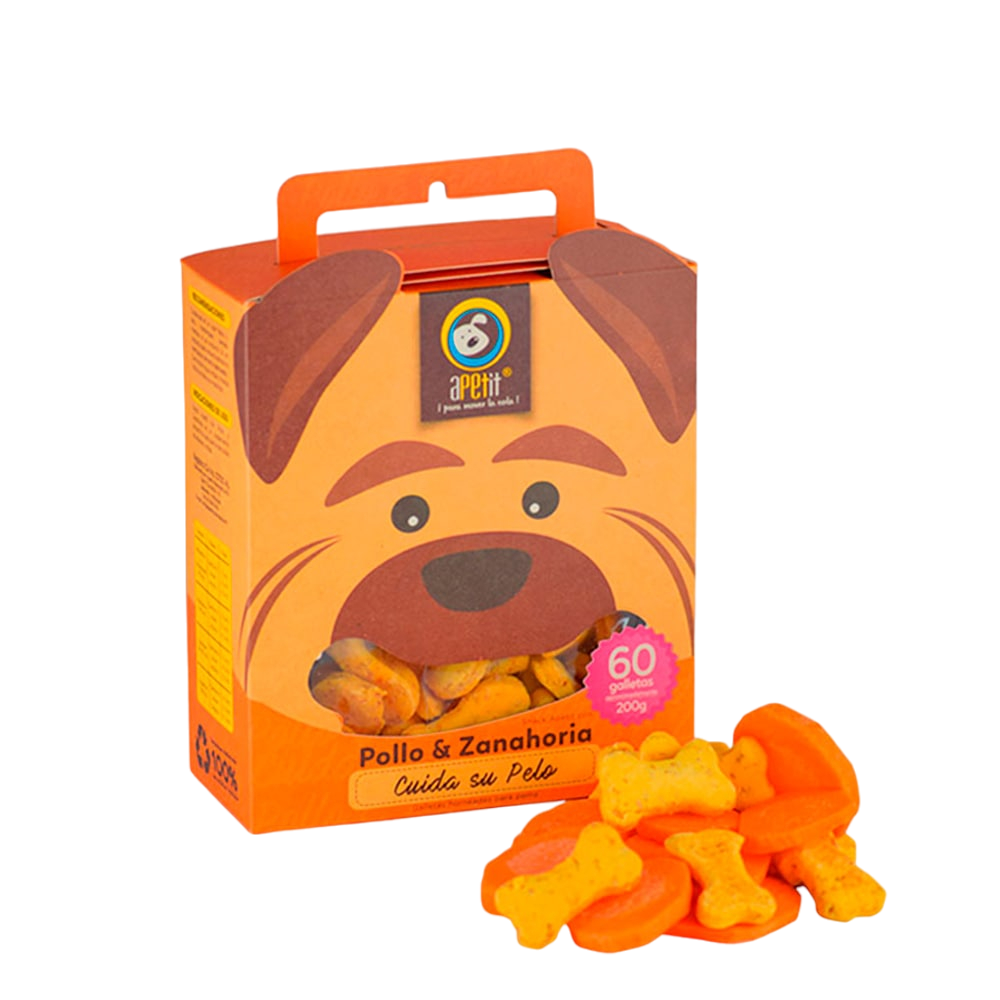 Las galletas para perro Apetit con sabor a pollo y zanahoria serán una opción saludable de snacks para tu perro. Estas galletas fabricadas con ingredientes 100% naturales contienen nutrientes que favorecerán la salud de la piel, el brillo del pelaje y la visión de tu perro. Son ricos snacks para perro con sabor a pollo que seguro disfrutará.